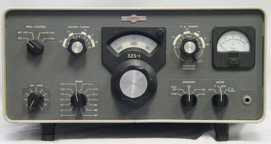 From the 1961 Collins Amateur Radio Equipment brochure: Collins highly flexible 32S-1 Transmitter covers all the amateur bands between 3.4 mc and 29.7 mc with a power input of 175 watts PEP on SSB or 160 watts on CW. It has a nominal output of 100 watts. The 32S-1 comes equipped with the crystal sockets, crystals and bandswitch positions for eleven 200 kc bands, with the standard amateur configuration equipped as follows: 3.4-3.6, 3.6-3.8, 3.8-4.0, 7.0-7.2, 7.2-7.4, 14.0-14.2, 14.2-14.4, 21.0-21.2, 21.2-21.4, 21.4-21.6, 28.5-28.7. Crystal sockets and bandswitch positions also are provided for two additional 200 kc bands between 28 mc and 29.7 mc. A fourteenth position, corresponding to the WWV position of the receiver, can be used for an additional 200 kc band in the 9.5-15.0 mc range, if desired. |